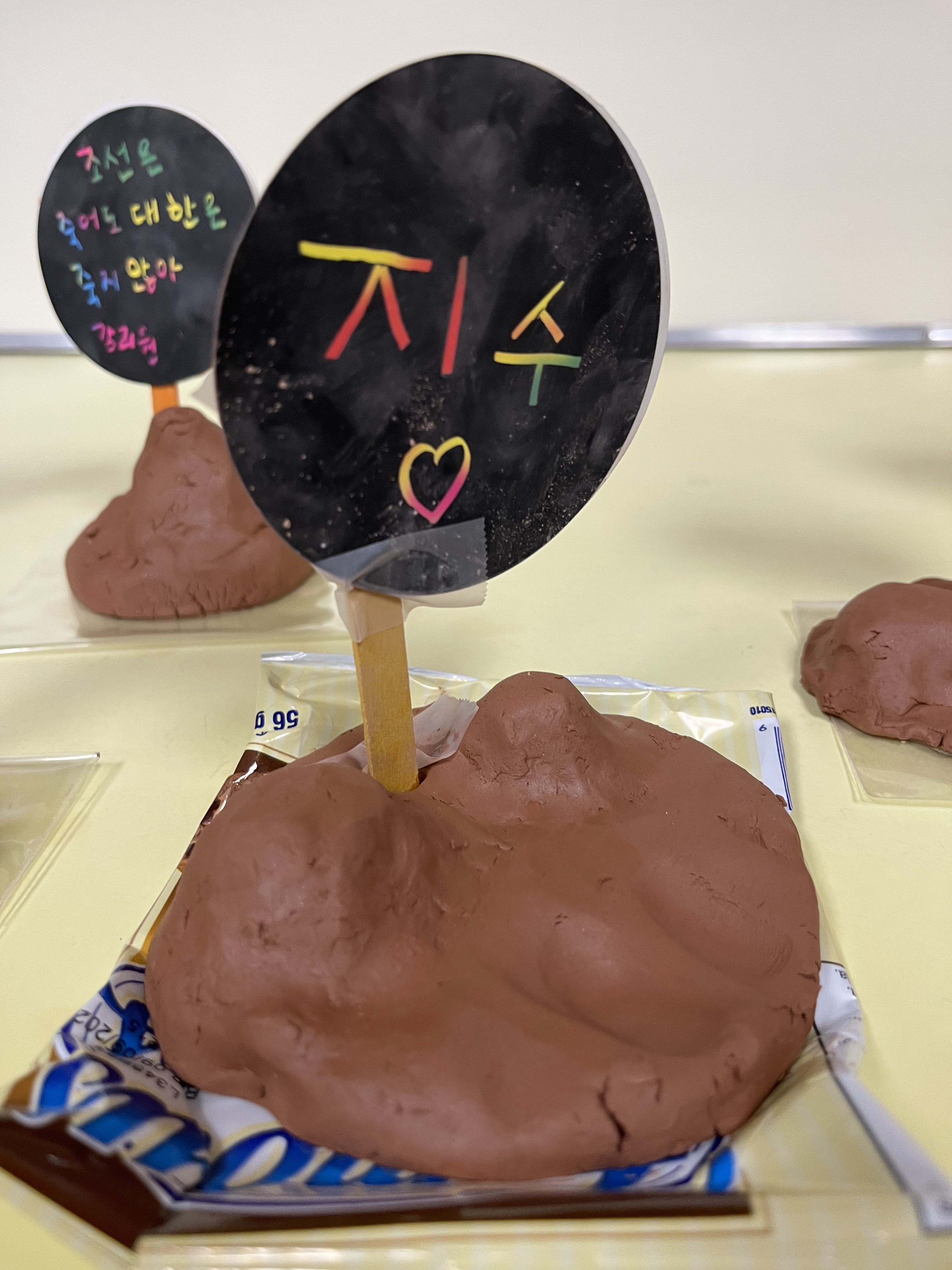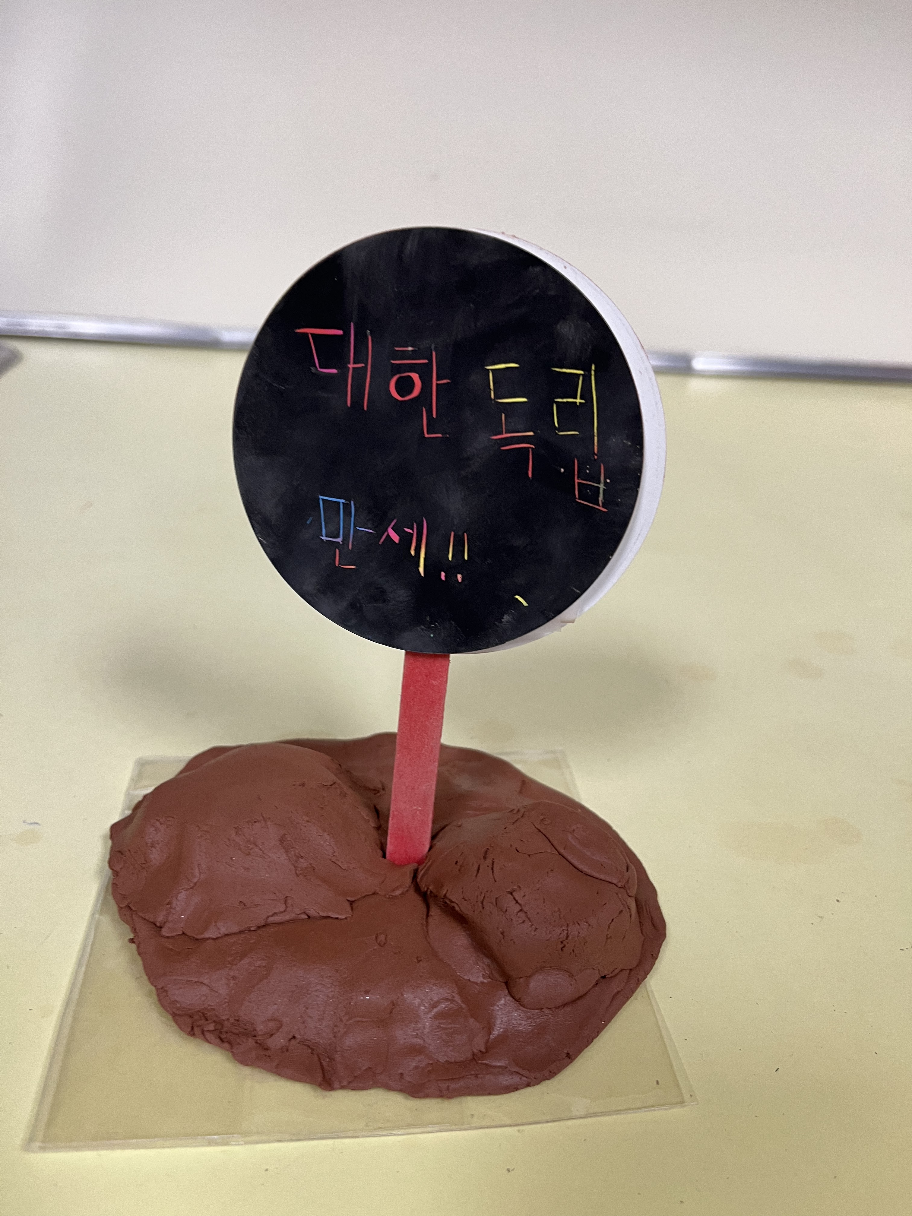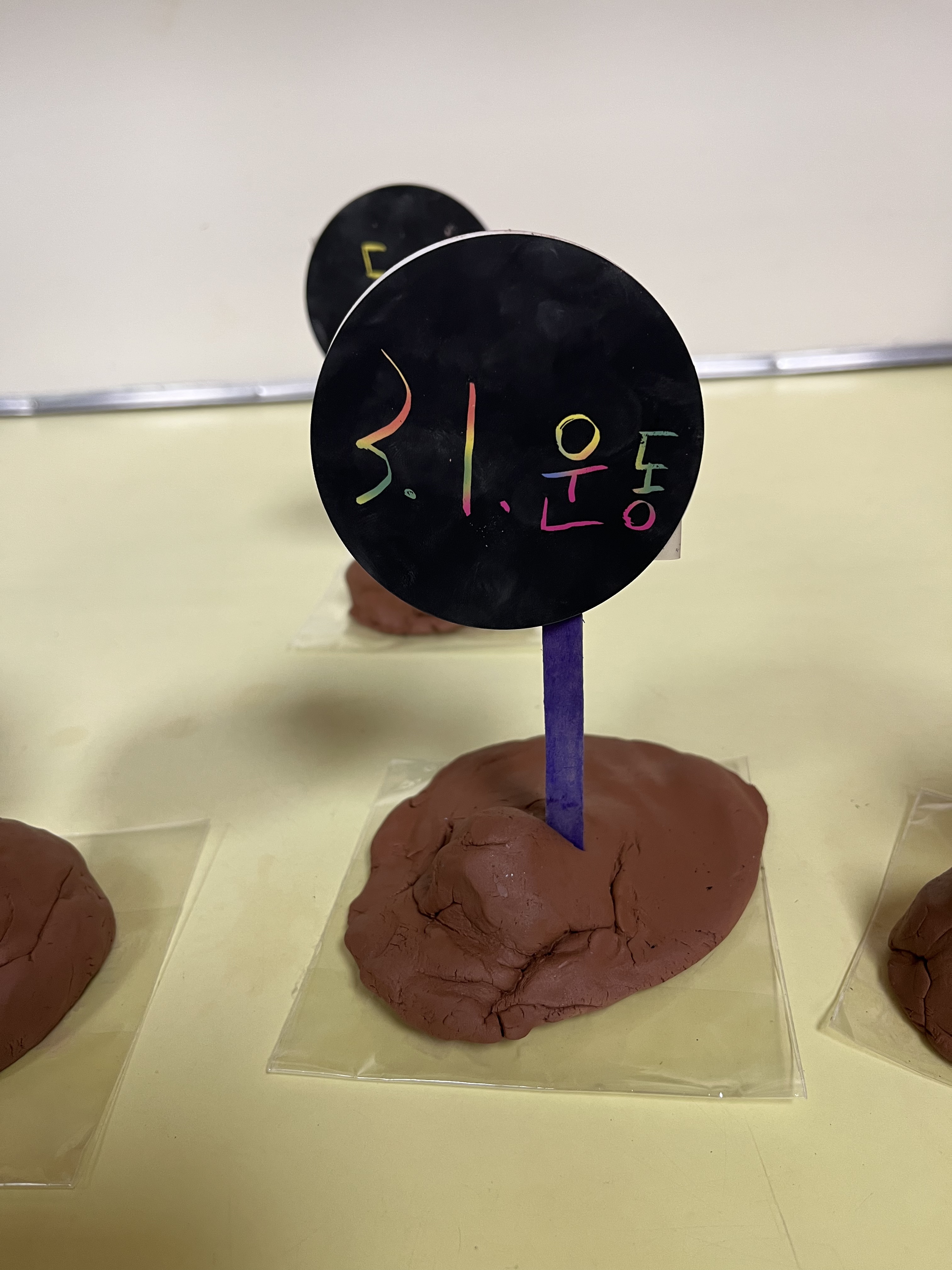 점토로 독도를 만들고 완성된 스크래치 페이퍼를 독도 위에 꽂아 보기로 하였습니다.