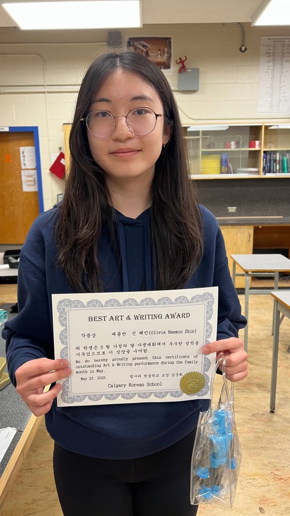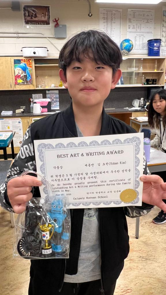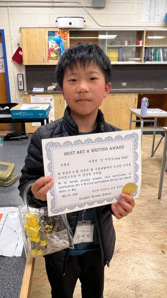[ 2024-25 세종반 ] 글짓기 대회 작품상 수상자는 누구??5월 가정의 달을 맞아 열린 글짓기 대회 ‘작품상 수상자’를 소개합니다.(왼쪽부터) 강이정, 김요한, 신해민 – “모두 축하합니다.”