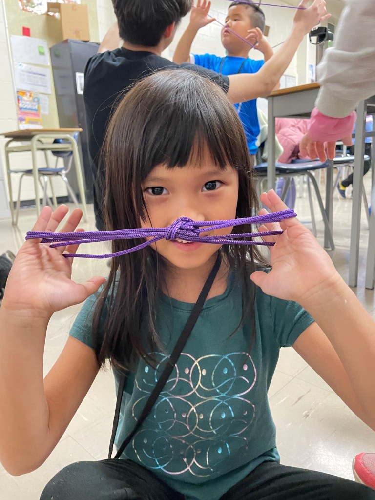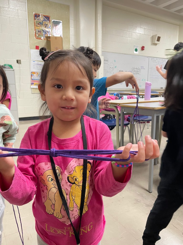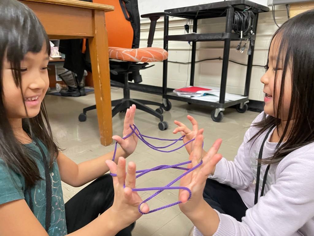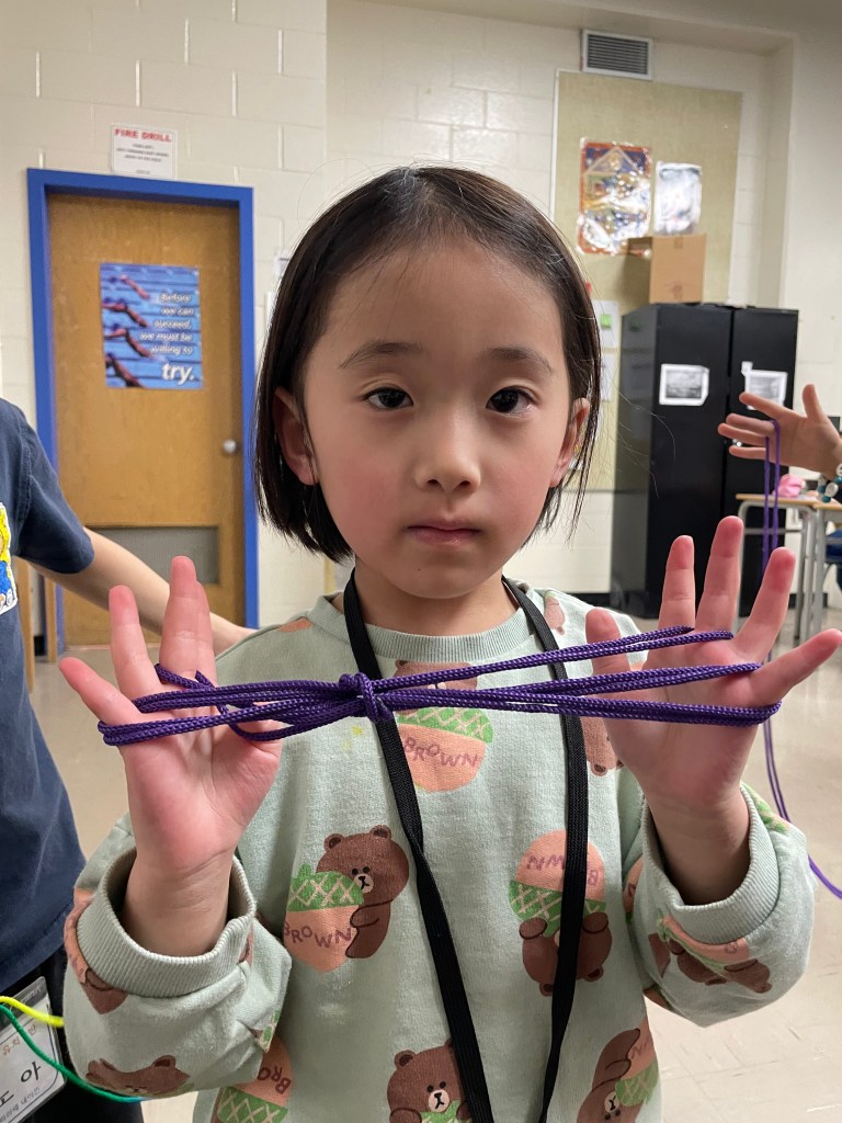 먼저 실놀이입니다. 한국에서 유년기를 보낸 학부모님이라면 모두 아실 놀이일 테지요. 유치반에서는 아이들이 더 쉽게 배울 수 있는 여러 모양 실놀이로 시작해 보았어요.